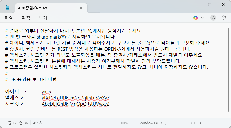STOCK-GATE는 각 증권사 OPEN-API ACCESS KEY, SECRET KEY를 텍스트 파일로 저장후, 불러오는 기능을 제공하고 있습니다. 아래는 텍스트 파일 예시입니다.