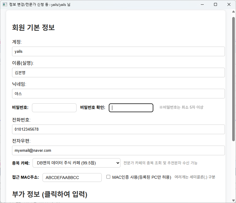 회원 가입창에 보이는 MAC 주소는 접근하는 PC의 네트워크 카드 고유 주소로서, 보안상 회원가입 창에서 입력됩니다.
